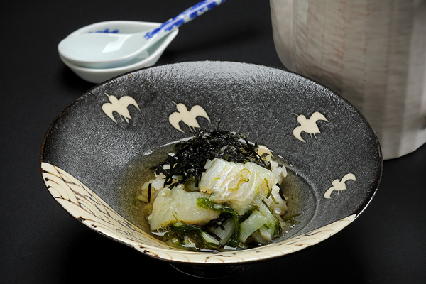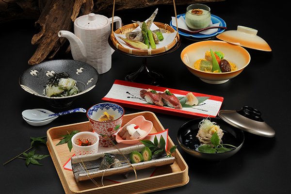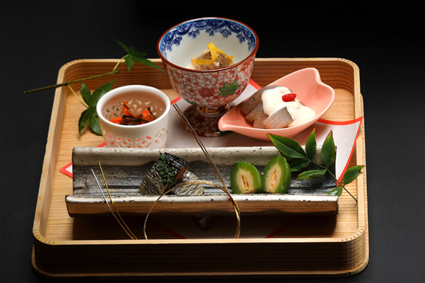 | 旬味 | 胡麻豆腐じゅうねん味噌掛け いかにんじん 煎りこんにゃくの白和え にしん山椒漬け 若桃甘露煮 |